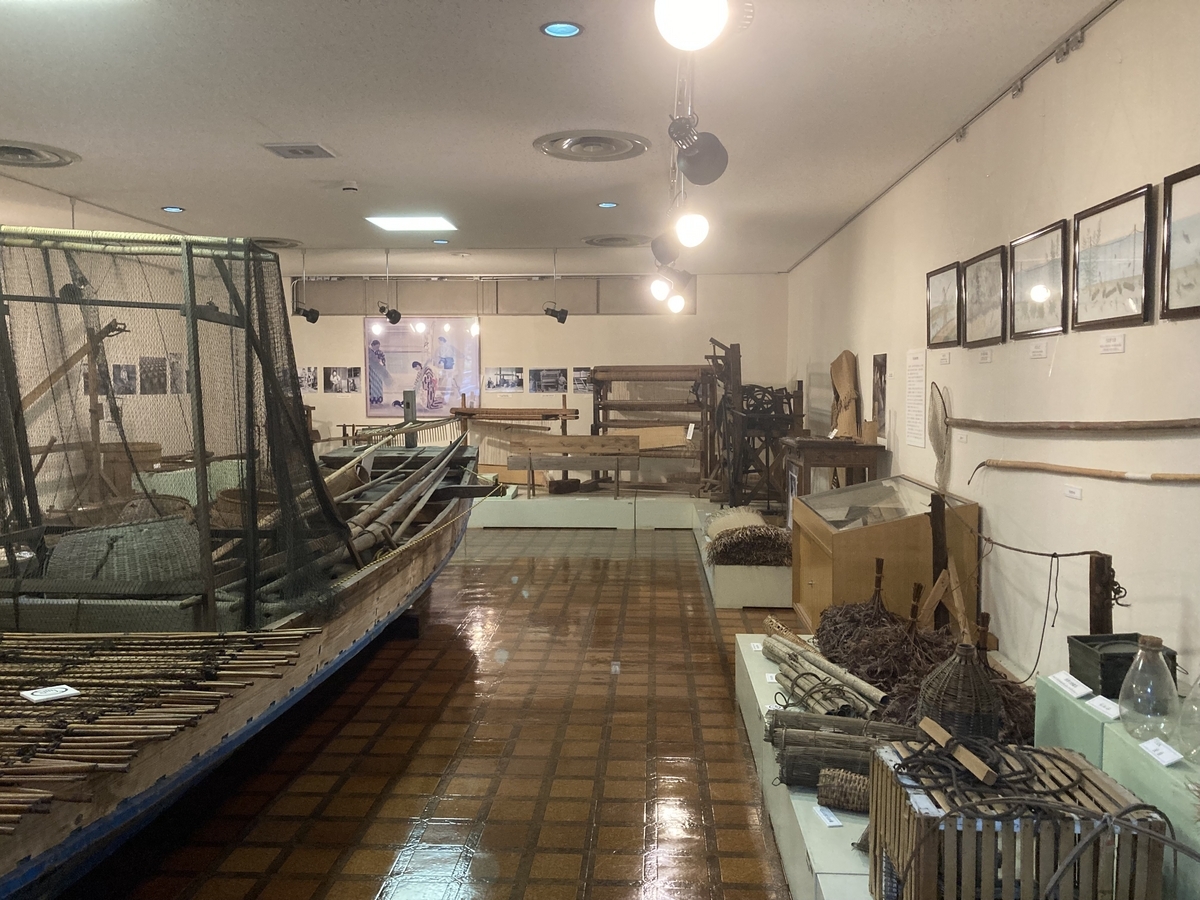 細江町ではイグサの栽培と、タタミやムシロの製造が盛んでした。江戸時代に地震による津波で、たんぼが潮をかぶり、稲作が難しくなってしまい、塩害に強いものの栽培と製造が必要になったため、イグサの栽培が始まったそうです。こちらが1階。浜名湖で漁をする道具も展示ありました。
